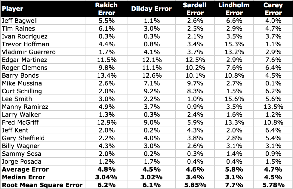 The biggest misses are still with the same players, but the true degree of my error is now made plain. I overshot Walker's private ballots by more than 12 percentage points, and Thome's by more than eight. Those aren't good performances no matter how you slice them. If we're focusing on the positives, I was within four percentage points on 16 of 23 players. My average error was 3.8 points, much better than last year when I had several double-digit misses, but my median error was 3.2 points, not as good as last year.