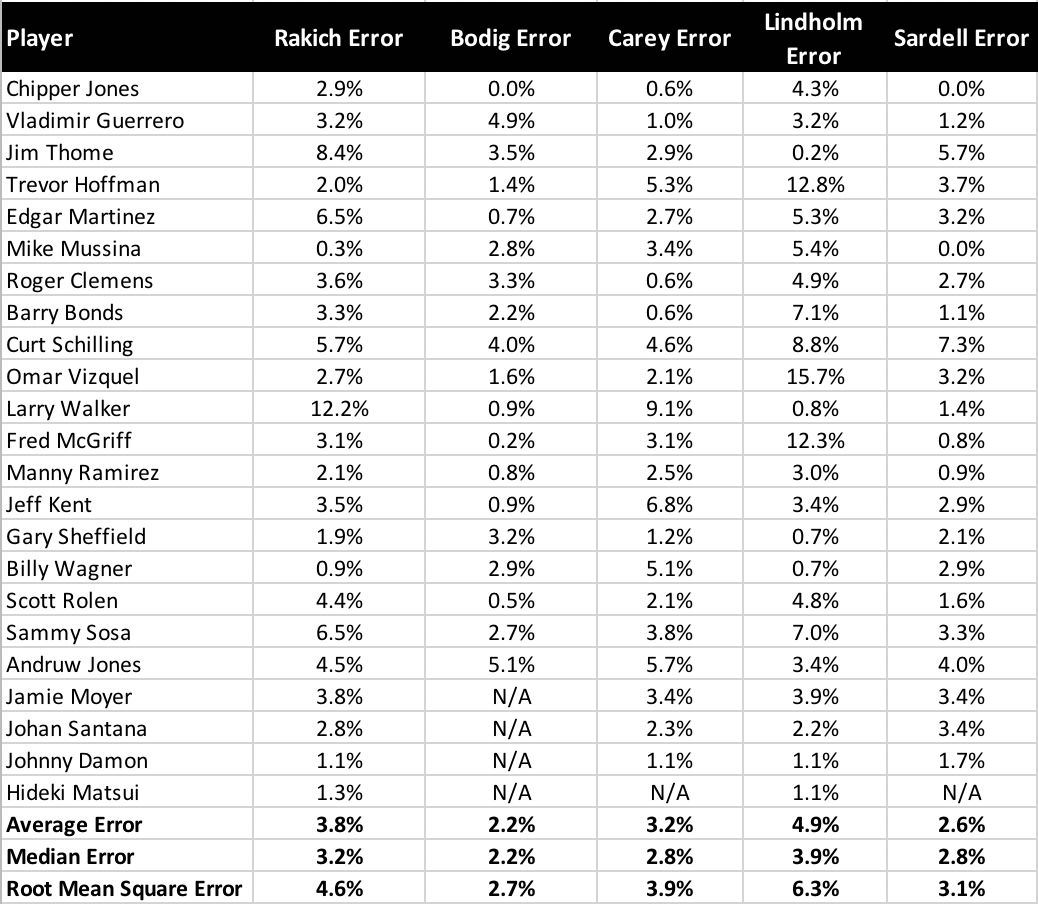 But where I really fell short was in comparison to other Hall of Fame forecasters: Chris Bodig, who published his first-ever projections this year on his website, Cooperstown Cred; Ross Carey, who hosts the Replacement Level Podcast and is the only one with mostly qualitative predictions; Scott Lindholm, who has been issuing his projections alongside me since day one; and Jason Sardell, who first issued his probabilistic forecast last year. Of them all, it was the rookie who performed the best: Bodig's private-ballot projections had a mean and median error of only 2.2 percentage points. His RMSE also ranked first (2.7 points), followed by Sardell (3.1), Carey (3.9), me (4.6), and Lindholm (6.3). Bodig also came the closest on the most players (10).