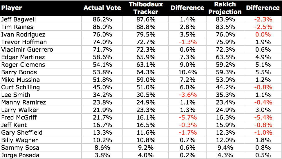 First, a brief rundown of my methodology. My Hall of Fame projections are based on the public ballots dutifully collected and shared with the world by Ryan Thibodaux (and, this year, his team of interns); I extend my gratitude to them again for sacrificing so much of their time doing so. Based on the percentage of public ballots each player is on to date, I calculate his estimated percentage of private (i.e., as yet unshared) votes based on how much those two numbers have differed in past Hall of Fame elections. These "Adjustment Factors"—positive for old-school candidates like Omar Vizquel, negative for steroid users or sabermetric darlings like Roger Clemens—are the demographic weighting to Ryan's raw polling data. And indeed, they produce more accurate results than just taking the Thibodaux Tracker as gospel: